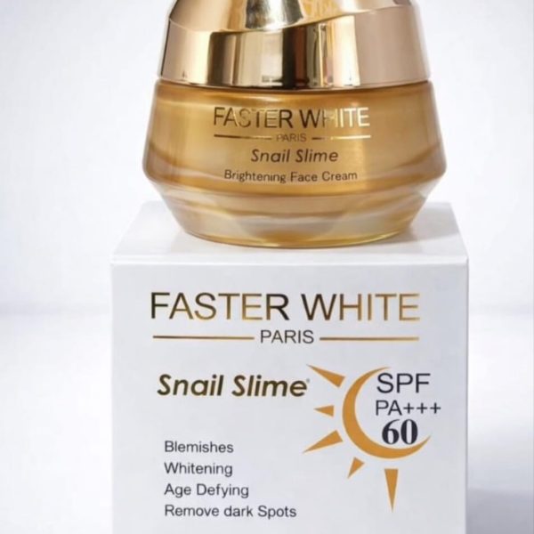 Faster White Paris Snail Slime Brightening Face Cream is a moisturizing and lightening treatment formulated to target skin imperfections while deeply hydrating the complexion. It is designed to even out skin tone and improve overall skin texture using the regenerative properties of snail slime extract.