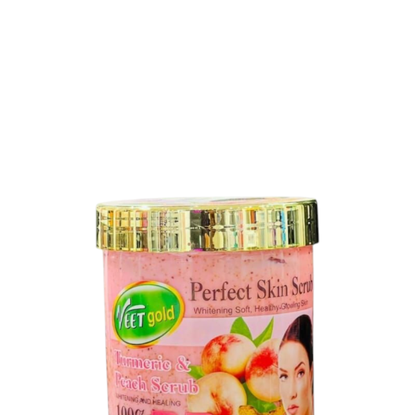 The Veet Gold Perfect Skin Turmeric And Peach Scrub is a skincare product that is produced with turmeric and peach to exfoliate the skin, remove dead skin cells, and brighten the complexion. It is meant for both the face and body and claims to help with issues like black spots, dark armpits, and acne, while promoting an overall even and fresh look for all skin types.