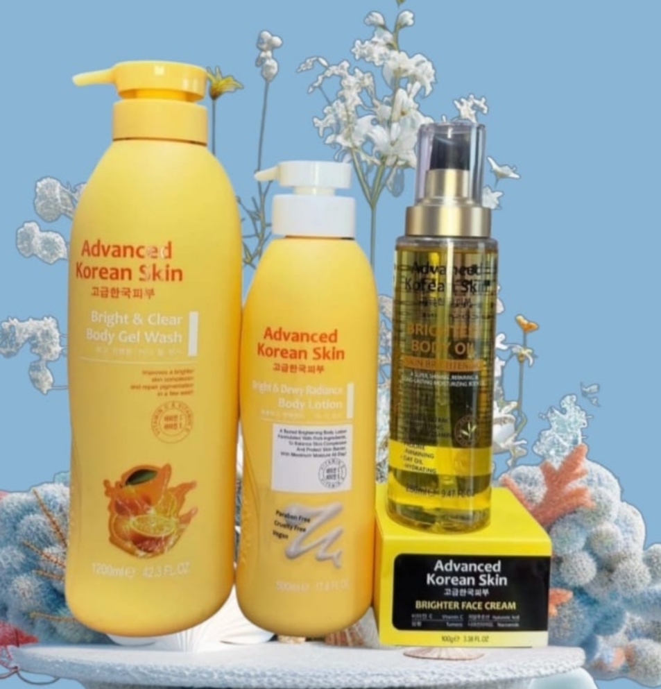 Advanced korean Skin Bright And Clear Body Gel Wash, Bright And Dewy Radiance Body Lotion, Brightest Body Oil And, Brighter Face Cream Set