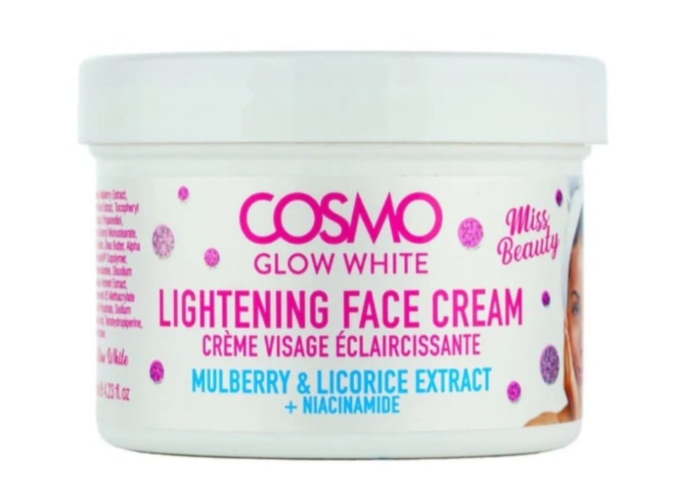 COSMO GLOW WHITE LIGHTENING FACE CREAM 125ML  with Mulberry & Licorice Extract is specially formulated to tackle uneven skin tone, dullness, and other common skin problems. The mulberry extract present increases skin elasticity, nourishes, and gives your skin a youthful, radiant glow.
