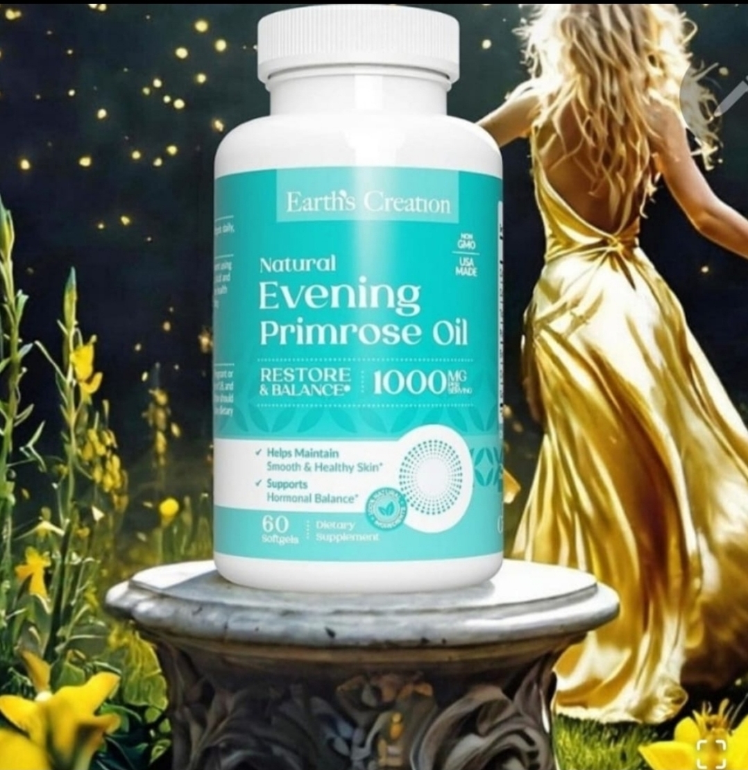 Earth’s Creation Natural Evening Primrose Oil 1000mg is a supplement rich in Omega-6 fatty acids (like GLA) that supports women’s hormonal balance, promotes glowing skin, and aids general wellness, easing PMS symptoms and contributing to skin hydration and heart health, making it ideal for holistic female health.