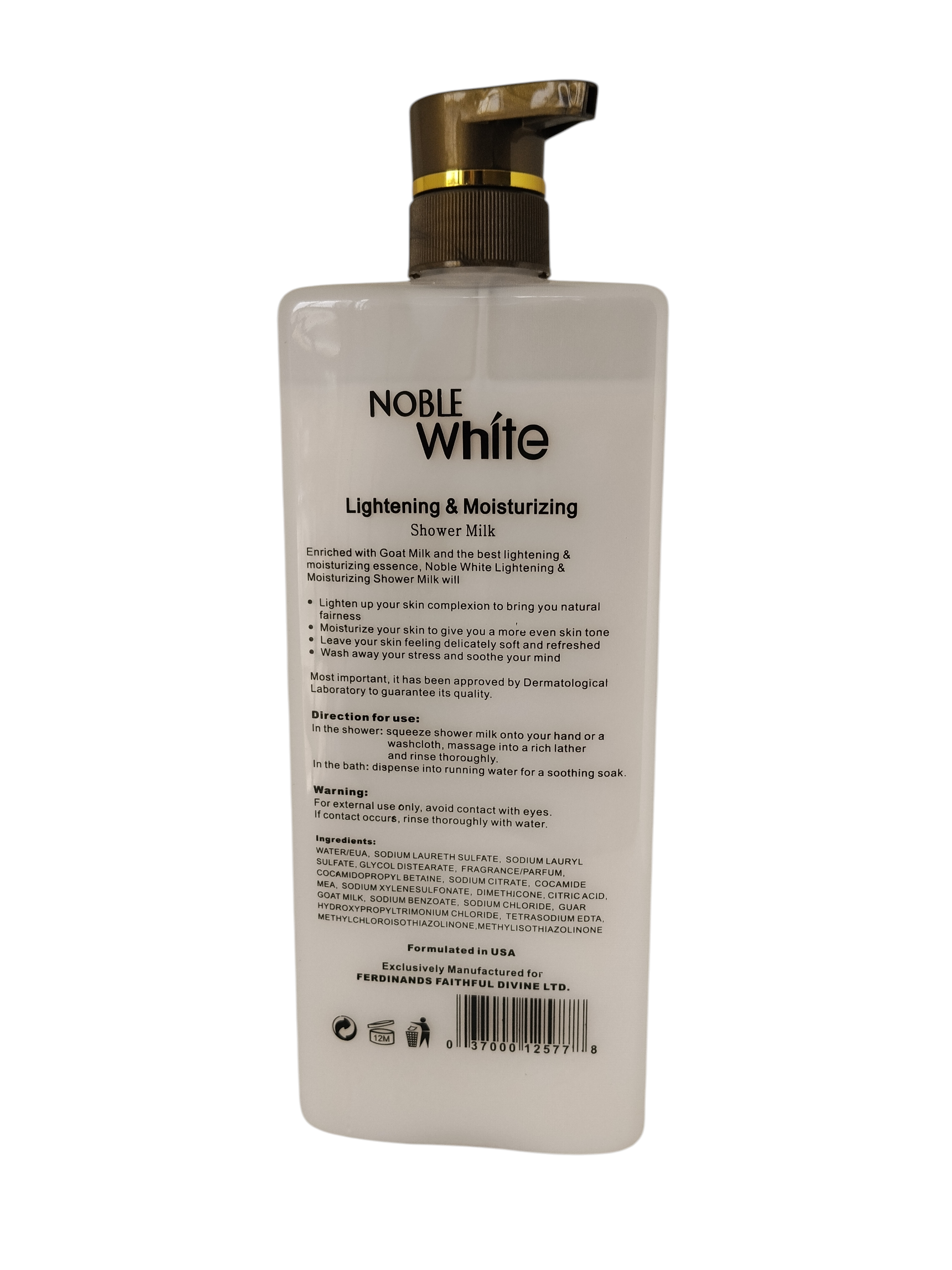 Noble White lightening and moisturizing shower milk Is enriched with goat milk and the best lightening and moisturizing essence, noble white lightening and shower milk lightens up your skin complexion to bring you natural fairness. The bath gives you a more even skin tone.