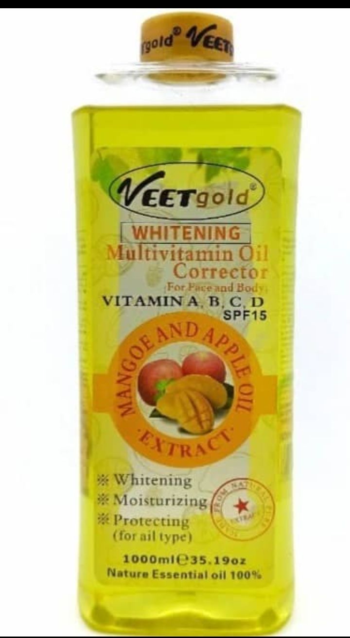 Veetgold multivitamin oil corrector is formulated from mixture of different plants to give the face and body a natural glowing skin. Veetgold oils are made from natural pure plant extract to erase and clean black spots, wrinkles, pimples and dead cells from the body and face.