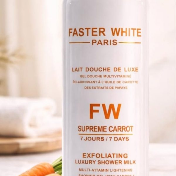 Faster White Supreme Carrot Body Lotion And Shower Gel, your duo for flawless, radiant skin: Our Faster White Carrot Whitening Body Lotion is a powerful yet gentle formula designed to brighten and unify skin tone within just 14 days without hydroquinone or harsh chemicals.