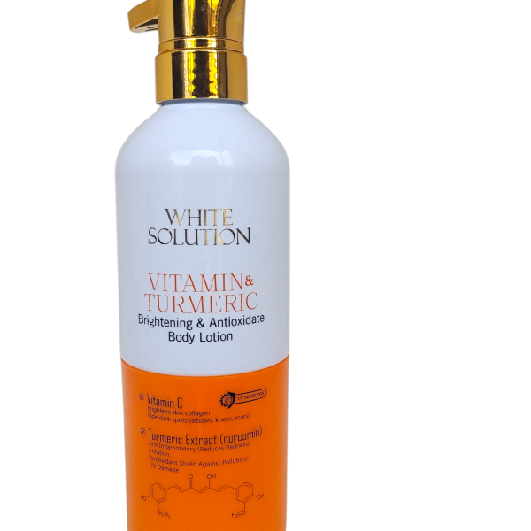 The White Solution Vitamin & Turmeric Brightening and Antioxidant Body Lotion (500ml) is an intensive, daily moisturizing lotion designed to brighten, even out skin tone, and reduce the appearance of dark spots, blemishes, and hyperpigmentation.