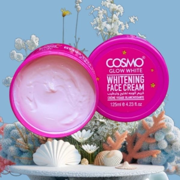 Cosmo Glow White Whitening Face Cream is a skincare product designed to brighten skin tone, reduce dark spots, and deeply moisturize the skin. It combines niacinamide, which improves skin clarity and reduces discoloration, with hyaluronic acid, which provides lasting hydration, to leave skin looking smoother, brighter, and more luminous.