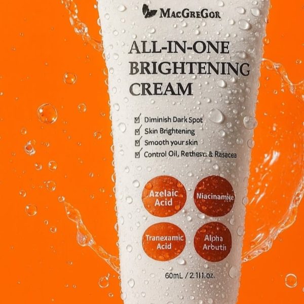 £16.99MacGregor All-in-One Brightening Cream is a potent skincare formula with Azelaic Acid, Niacinamide, Tranexamic Acid, and Alpha-Arbutin, designed to fade dark spots, reduce redness, control oil, and smooth skin for a more radiant, even-toned complexion. It delivers visible results by tackling discoloration and promoting a soft, glowing finish, making it a comprehensive solution for hyperpigmentation.